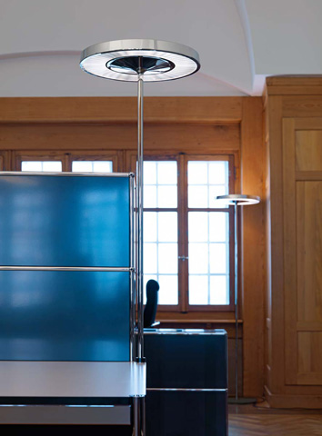 belux disk wird dimmbar und mit Multisens in den Farben Weiss, Schwarz und Chrom angeboten. Neben der Steh- und Pendelleuchte ist belux disk auch als Tischaufbauleuchte erhältlich. Sowohl die fixe Befestigung an einer beliebigen Tischplatte, als auch die direkte Anbindung am USM Haller Tischsystem überzeugt in der klaren Ästhetik und Eleganz. Mit 8590 lm bei 72 W sorgt die Leuchte für viel indirektes und direktes Licht.